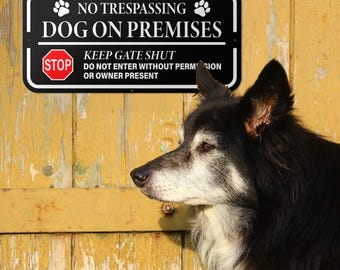 Schild Mit Aufschrift "No Trespassing Dog On Premises Keep Gate Shut