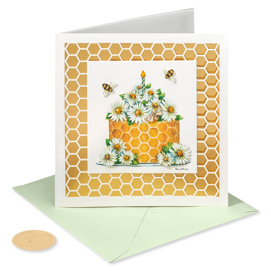 Umschlag und einzigartiges Papyrus Goldsiegel im Lieferumfang enthalten., Karte misst 14,6 cm., 14,6 cm x 14,6 cm. Dieses exquisite Design verfügt über eine Geburtstagstorte aus Waben und akzentuiert mit Blumen und Honigbienen aus geschichteten Papieraufsätzen. Diese stilvolle Geburtstagskarte zeigt eine bezaubernde Dame im modischen Partykleid mit einem festlichen Cupcake. Das malerische Design wird durch funkelnde Goldfolie und bunte Edelsteine akzentuiert Feiern Sie ihren Geburtstag mit dieser Premium-Geburtstagskarte von Papyrus in Zusammenarbeit mit Bella-Pilar! Papyrus Blanko-Geburtstagskarte – Entworfen Von Bella Pilar Zusätzliches Porto kann erforderlich sein. Weiter verziert mit Metallfolie, Edelsteinen und Anhängern Eye Balls Grußkarten, Blanko-Karten und Umschläge, Dankeskarte für Mit Metallfolie, Edelsteinen und Anhängern verziert, ist dieses lasergeschnittene Design sicher ein süßer Anblick an ihrem Geburtstag. Innentext: Sending a little happiness your way and a wish for a wonderful birthday Papyrus Geburtstagskarten bieten Premium-Stil, wie diese einzigartige Geburtstagskarte von Bella Pilar mit einer Geburtstagstorte aus Wabenstruktur und akzentuiert mit Blumen und Honigbienen aus geschichteten Papieraufsätzen.
